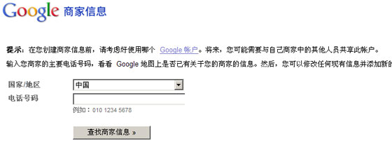 3.選企業(yè)所在的國家和填入企業(yè)主要電話號(hào)碼,建議使用手機(jī)號(hào)碼,方便google驗(yàn)證,填完點(diǎn)擊“查找商家信息”按鈕。