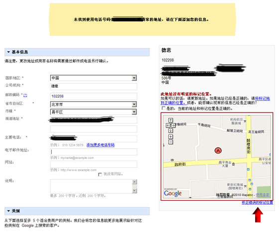 在下面這個(gè)頁面中如實(shí)地填寫企業(yè)的相關(guān)資料,并在右側(cè)的預(yù)覽中檢查自己是否有大馬哈,填寫的信息是否正確,如果發(fā)現(xiàn)位置出現(xiàn)錯(cuò)誤的話,請(qǐng)點(diǎn)擊紅色箭頭處的“修正錯(cuò)誤的標(biāo)記位置”鏈接進(jìn)行修正。記得勾選右側(cè)預(yù)覽中“是的,當(dāng)前的地址和標(biāo)記位置是正確的。”