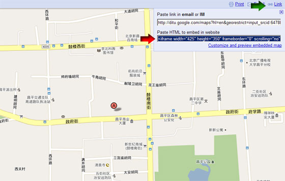 彈出的新網(wǎng)頁會(huì)顯示屬于自己企業(yè)的地圖了,這個(gè)時(shí)候證明你已經(jīng)大獲全勝了,別急,再點(diǎn)擊網(wǎng)頁右上角“Link”鏈接(下圖綠色箭頭處),彈出可以為網(wǎng)頁嵌入代碼(下圖紅色箭頭處),拷貝框中的代碼到相關(guān)的企業(yè)網(wǎng)站頁面即完成了,建議放在聯(lián)系主要的網(wǎng)頁中。